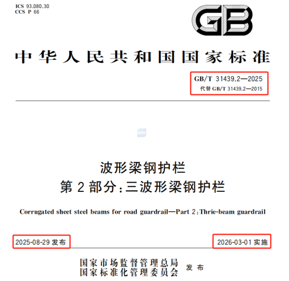 GB/T 31439.2-2025《波形梁鋼護(hù)欄 第2部分:三波形梁鋼護(hù)欄》?于2025年8月29日發(fā)布,計(jì)劃于2026年3月1日實(shí)施,替代2015版標(biāo)準(zhǔn),規(guī)范公路交通工程中三波形梁鋼護(hù)欄的技術(shù)要求與安全性能。