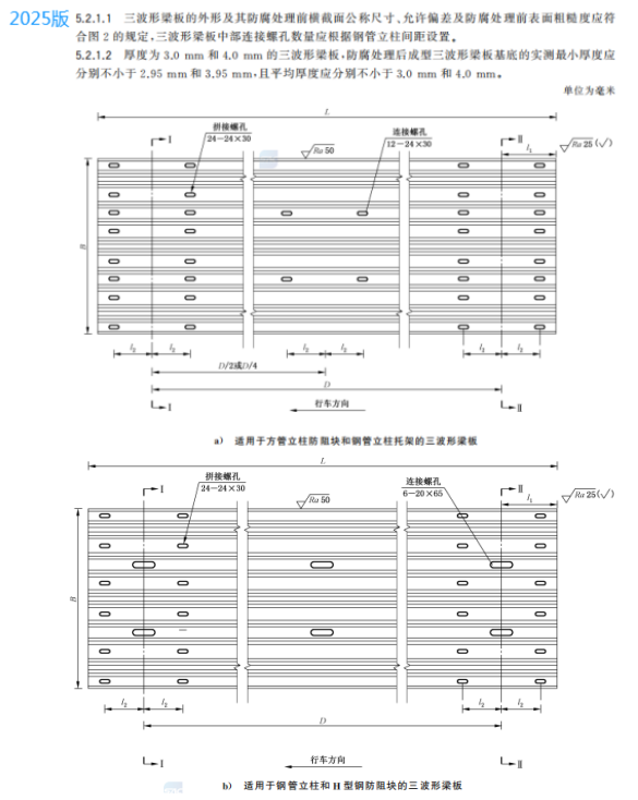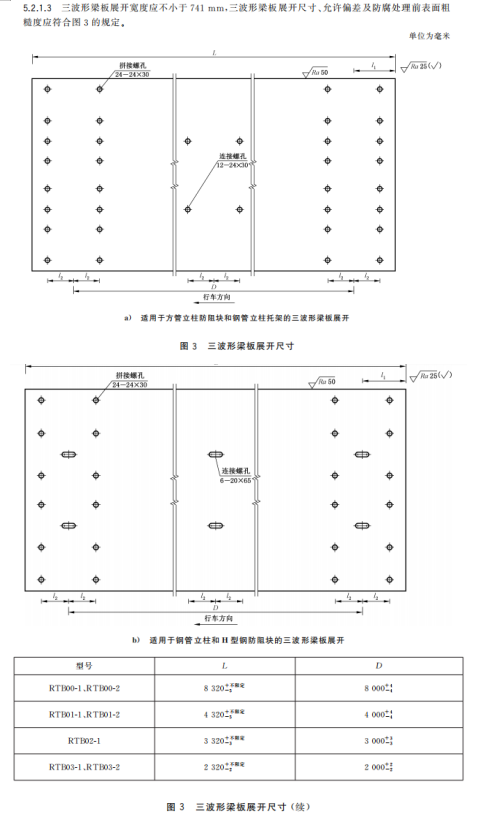 m) 增加了三波形梁板中部連接螺孔數(shù)量應(yīng)根據(jù)鋼管立柱間距設(shè)置的要求、展開(kāi)尺寸及允許偏差的要求(見(jiàn)5.2.1.1~5.2.1.3);